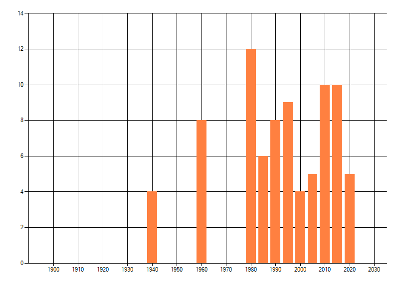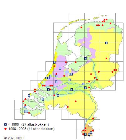 Het aantal atlasblokken (5x5 km) waarin de soort is gemeld binnen een periode van vijf jaar (vanaf 1980) of twintig jaar. Niet gecorrigeerd voor waarnemersinspanning en het aantal doorgegeven waarnemingen kan sterk variëren per periode, dus een trend in verspreiding kan hier niet direct uit worden afgelezen. Het opgegeven jaartal is het eerste jaar van de periode. Bron: gevalideerde waarnemingen uit de NDFF.