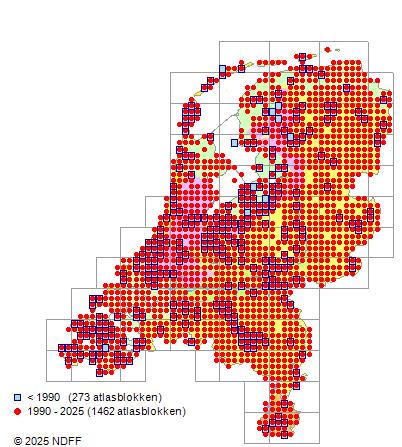 Het aantal atlasblokken (5x5 km) waarin de soort is gemeld binnen een periode van vijf jaar (vanaf 1980) of twintig jaar. Niet gecorrigeerd voor waarnemersinspanning en het aantal doorgegeven waarnemingen kan sterk variëren per periode, dus een trend in verspreiding kan hier niet direct uit worden afgelezen. Het opgegeven jaartal is het eerste jaar van de periode. Bron: gevalideerde waarnemingen uit de NDFF.