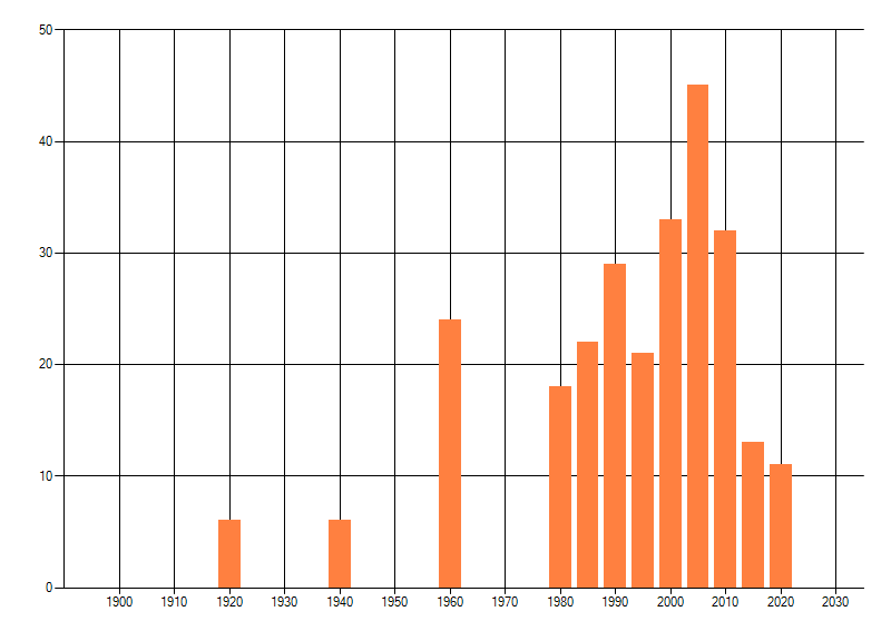 Het aantal atlasblokken (5x5 km) waarin de soort is gemeld binnen een periode van vijf jaar (vanaf 1980) of twintig jaar. Niet gecorrigeerd voor waarnemersinspanning en het aantal doorgegeven waarnemingen kan sterk variëren per periode, dus een trend in verspreiding kan hier niet direct uit worden afgelezen. Het opgegeven jaartal is het eerste jaar van de periode. Bron: gevalideerde waarnemingen uit de NDFF.