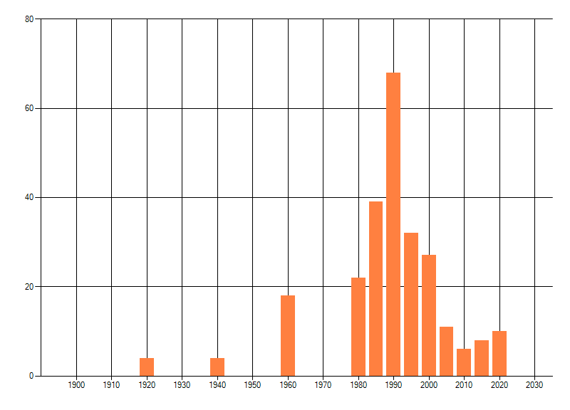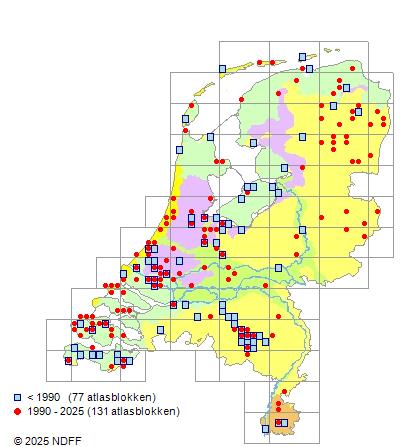 Het aantal atlasblokken (5x5 km) waarin de soort is gemeld binnen een periode van vijf jaar (vanaf 1980) of twintig jaar. Niet gecorrigeerd voor waarnemersinspanning en het aantal doorgegeven waarnemingen kan sterk variëren per periode, dus een trend in verspreiding kan hier niet direct uit worden afgelezen. Het opgegeven jaartal is het eerste jaar van de periode. Bron: gevalideerde waarnemingen uit de NDFF.