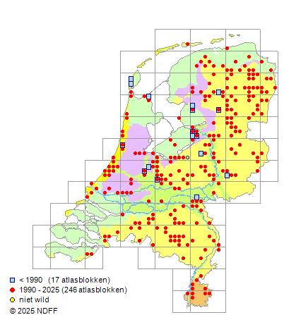Het aantal atlasblokken (5x5 km) waarin de soort is gemeld binnen een periode van vijf jaar (vanaf 1980) of twintig jaar. Niet gecorrigeerd voor waarnemersinspanning en het aantal doorgegeven waarnemingen kan sterk variëren per periode, dus een trend in verspreiding kan hier niet direct uit worden afgelezen. Het opgegeven jaartal is het eerste jaar van de periode. Bron: gevalideerde waarnemingen uit de NDFF.