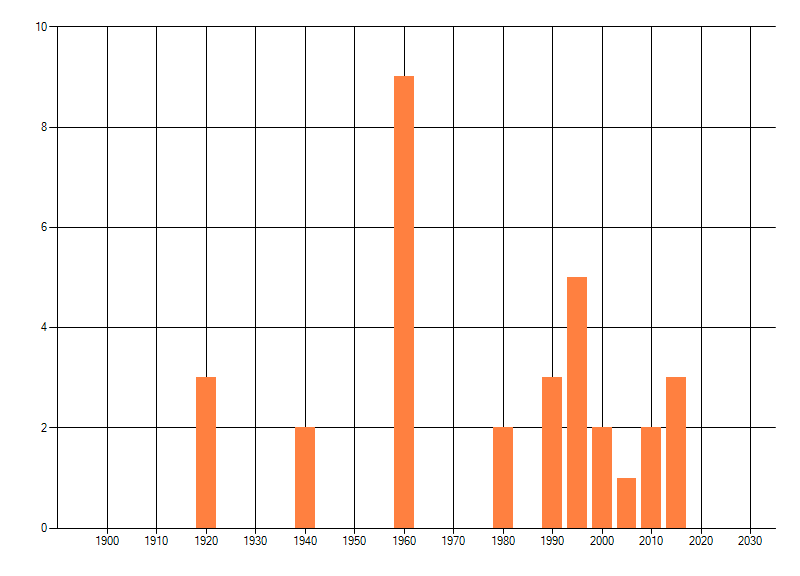 Het aantal atlasblokken (5x5 km) waarin de soort is gemeld binnen een periode van vijf jaar (vanaf 1980) of twintig jaar. Niet gecorrigeerd voor waarnemersinspanning en het aantal doorgegeven waarnemingen kan sterk variëren per periode, dus een trend in verspreiding kan hier niet direct uit worden afgelezen. Het opgegeven jaartal is het eerste jaar van de periode. Bron: gevalideerde waarnemingen uit de NDFF.