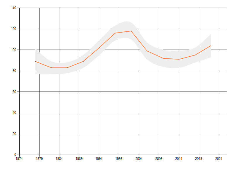 Gemiddelde trend van het aantal kilometerhokken waarin de soort voorkomt, weergegeven als indexcijfer (1975-1978 = 100). De trend is gecorrigeerd voor waarnemersinspanning en geeft de relatieve verandering in het aantal bezette kilometerhokken weer. Voor de berekening worden de data per periode van vier jaar samengenomen. In de grafiek correspondeert ieder punt met het laatste jaar van zo'n periode.