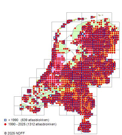 Het aantal atlasblokken (5x5 km) waarin de soort is gemeld binnen een periode van vijf jaar (vanaf 1980) of twintig jaar. Niet gecorrigeerd voor waarnemersinspanning en het aantal doorgegeven waarnemingen kan sterk variëren per periode, dus een trend in verspreiding kan hier niet direct uit worden afgelezen. Het opgegeven jaartal is het eerste jaar van de periode. Bron: gevalideerde waarnemingen uit de NDFF.