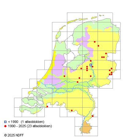 Het aantal atlasblokken (5x5 km) waarin de soort is gemeld binnen een periode van vijf jaar (vanaf 1980) of twintig jaar. Niet gecorrigeerd voor waarnemersinspanning en het aantal doorgegeven waarnemingen kan sterk variëren per periode, dus een trend in verspreiding kan hier niet direct uit worden afgelezen. Het opgegeven jaartal is het eerste jaar van de periode. Bron: gevalideerde waarnemingen uit de NDFF.
