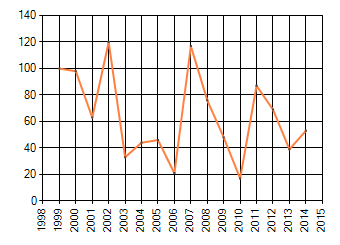 Trend in het geschatte aantal individuen van paddenstoelen in bossen op de hoge zandgronden, weergegeven als indexcijfer (eerste jaar = 100). Bron: