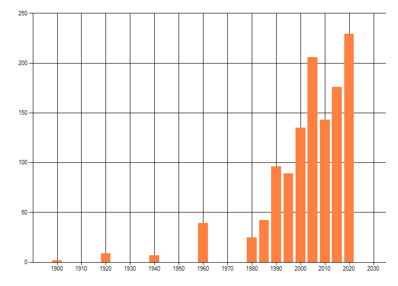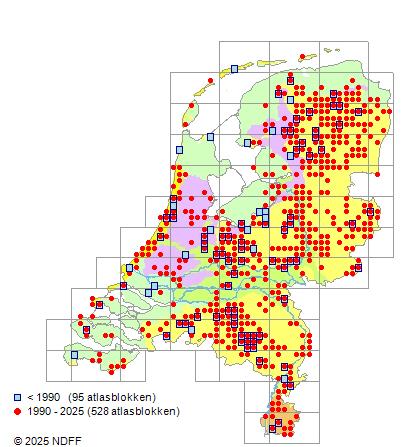 Het aantal atlasblokken (5x5 km) waarin de soort is gemeld binnen een periode van vijf jaar (vanaf 1980) of twintig jaar. Niet gecorrigeerd voor waarnemersinspanning en het aantal doorgegeven waarnemingen kan sterk variëren per periode, dus een trend in verspreiding kan hier niet direct uit worden afgelezen. Het opgegeven jaartal is het eerste jaar van de periode. Bron: gevalideerde waarnemingen uit de NDFF.