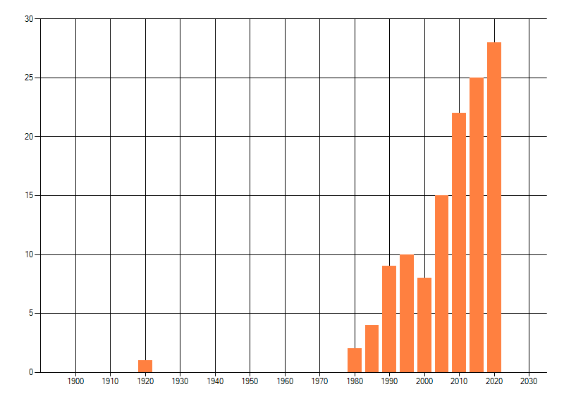 Het aantal atlasblokken (5x5 km) waarin de soort is gemeld binnen een periode van vijf jaar (vanaf 1980) of twintig jaar. Niet gecorrigeerd voor waarnemersinspanning en het aantal doorgegeven waarnemingen kan sterk variëren per periode, dus een trend in verspreiding kan hier niet direct uit worden afgelezen. Het opgegeven jaartal is het eerste jaar van de periode. Bron: gevalideerde waarnemingen uit de NDFF.