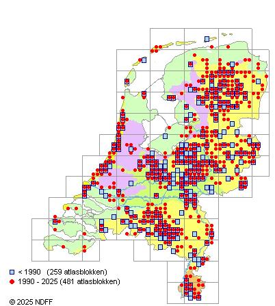 Het aantal atlasblokken (5x5 km) waarin de soort is gemeld binnen een periode van vijf jaar (vanaf 1980) of twintig jaar. Niet gecorrigeerd voor waarnemersinspanning en het aantal doorgegeven waarnemingen kan sterk variëren per periode, dus een trend in verspreiding kan hier niet direct uit worden afgelezen. Het opgegeven jaartal is het eerste jaar van de periode. Bron: gevalideerde waarnemingen uit de NDFF.