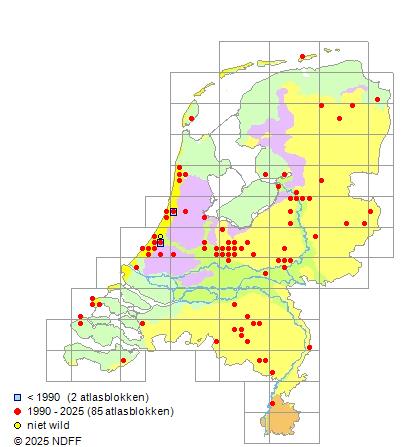Het aantal atlasblokken (5x5 km) waarin de soort is gemeld binnen een periode van vijf jaar (vanaf 1980) of twintig jaar. Niet gecorrigeerd voor waarnemersinspanning en het aantal doorgegeven waarnemingen kan sterk variëren per periode, dus een trend in verspreiding kan hier niet direct uit worden afgelezen. Het opgegeven jaartal is het eerste jaar van de periode. Bron: gevalideerde waarnemingen uit de NDFF.