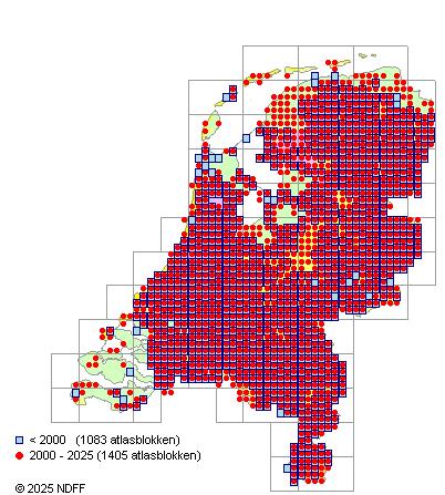 CC BY-NC-SA 3.0 NLVerspreidingNederlandPlaatselijk vrij algemeen, maar zeldzaam in de Hollandse duinen, het noordelijk zeekleigebied, Flevoland en Zuid-Limburg. Niet in grote delen van Zeeland en op enkele Waddeneilanden. Ingeburgerd tussen 1900 en 1924.