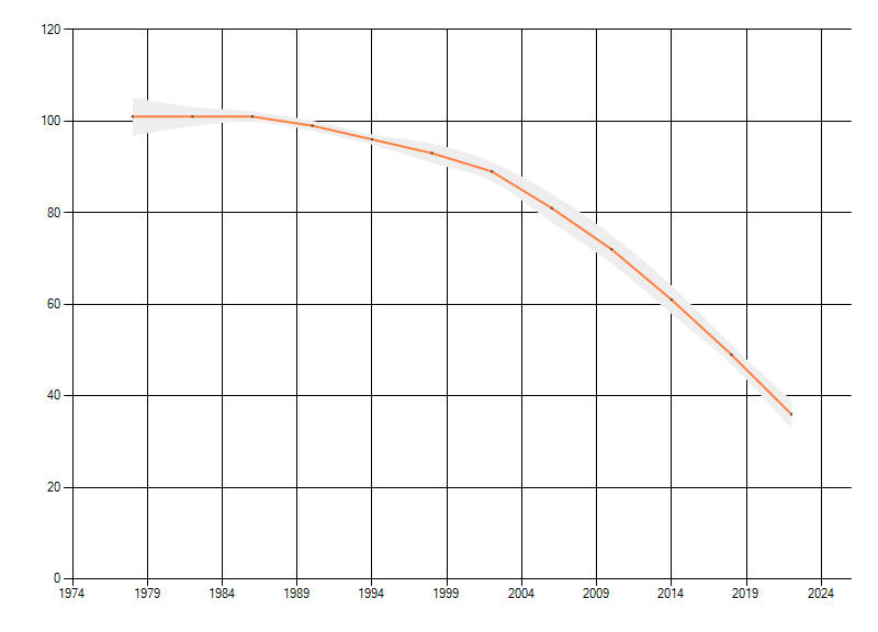 Gemiddelde trend van het aantal kilometerhokken waarin de soort voorkomt, weergegeven als indexcijfer (1975-1978 = 100).