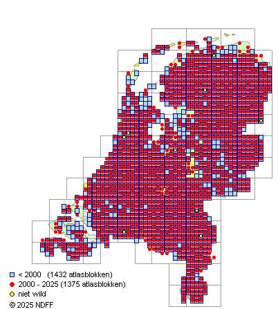 CC BY-NC-SA 3.0 NLVerspreidingNederlandZeer algemeen, maar vrij zeldzaam op de Waddeneilanden, in Zuid-Limburg en in Zeeland.