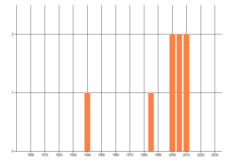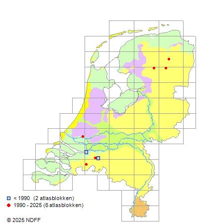 Het aantal atlasblokken (5x5 km) waarin de soort is gemeld binnen een periode van vijf jaar (vanaf 1980) of twintig jaar. Niet gecorrigeerd voor waarnemersinspanning en het aantal doorgegeven waarnemingen kan sterk variëren per periode, dus een trend in verspreiding kan hier niet direct uit worden afgelezen. Het opgegeven jaartal is het eerste jaar van de periode. Bron: gevalideerde waarnemingen uit de NDFF.