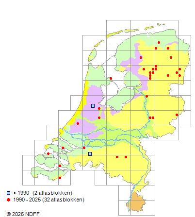 Het aantal atlasblokken (5x5 km) waarin de soort is gemeld binnen een periode van vijf jaar (vanaf 1980) of twintig jaar. Niet gecorrigeerd voor waarnemersinspanning en het aantal doorgegeven waarnemingen kan sterk variëren per periode, dus een trend in verspreiding kan hier niet direct uit worden afgelezen. Het opgegeven jaartal is het eerste jaar van de periode. Bron: gevalideerde waarnemingen uit de NDFF.