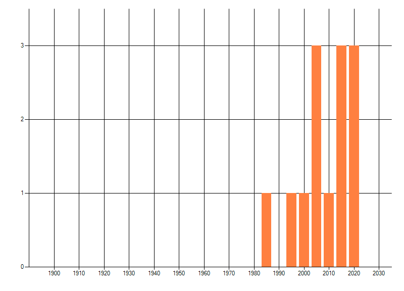 Het aantal atlasblokken (5x5 km) waarin de soort is gemeld binnen een periode van vijf jaar (vanaf 1980) of twintig jaar. Niet gecorrigeerd voor waarnemersinspanning en het aantal doorgegeven waarnemingen kan sterk variëren per periode, dus een trend in verspreiding kan hier niet direct uit worden afgelezen. Het opgegeven jaartal is het eerste jaar van de periode. Bron: gevalideerde waarnemingen uit de NDFF.
