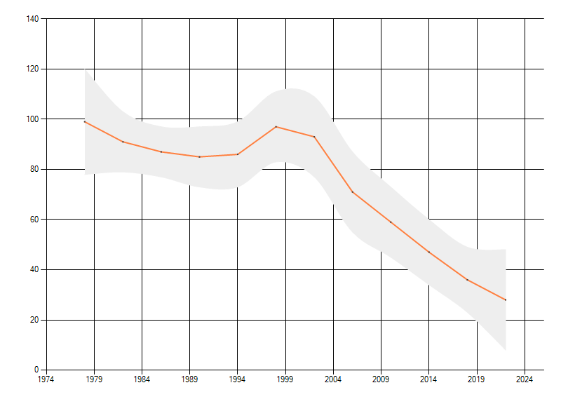 Gemiddelde trend van het aantal kilometerhokken waarin de soort voorkomt, weergegeven als indexcijfer (1975-1978 = 100).