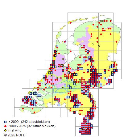 CC BY-NC-SA 3.0 NLVerspreidingNederlandVrij algemeen in Zuid-Limburg en zeldzaam in het rivierengebied, in Twente, in de Achterhoek en rondom Nijmegen. Elders zeer zeldzaam. Vrijwel niet in Noordoost-Nederland en niet op de Waddeneilanden.