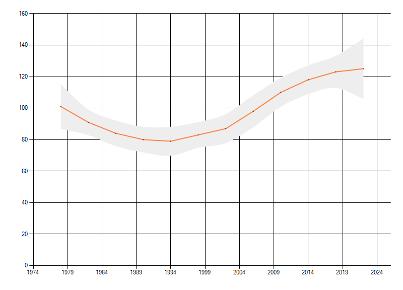 Gemiddelde trend van het aantal kilometerhokken waarin de soort voorkomt, weergegeven als indexcijfer (1975-1978 = 100).