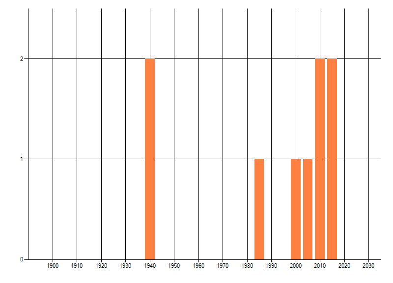 Het aantal atlasblokken (5x5 km) waarin de soort is gemeld binnen een periode van vijf jaar (vanaf 1980) of twintig jaar. Niet gecorrigeerd voor waarnemersinspanning en het aantal doorgegeven waarnemingen kan sterk variëren per periode, dus een trend in verspreiding kan hier niet direct uit worden afgelezen. Het opgegeven jaartal is het eerste jaar van de periode. Bron: gevalideerde waarnemingen uit de NDFF.