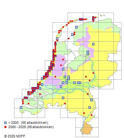 Het aantal atlasblokken (5x5 km) waarin de soort is gemeld binnen een periode van vijf jaar (vanaf 1980) of twintig jaar. Niet gecorrigeerd voor waarnemersinspanning en het aantal doorgegeven waarnemingen kan sterk variëren per periode, dus een trend in verspreiding kan hier niet direct uit worden afgelezen. Het opgegeven jaartal is het eerste jaar van de periode. Bron: gevalideerde waarnemingen uit de NDFF.