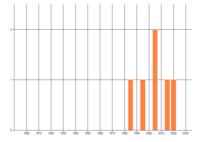 Het aantal atlasblokken (5x5 km) waarin de soort is gemeld binnen een periode van vijf jaar (vanaf 1980) of twintig jaar. Niet gecorrigeerd voor waarnemersinspanning en het aantal doorgegeven waarnemingen kan sterk variëren per periode, dus een trend in verspreiding kan hier niet direct uit worden afgelezen. Het opgegeven jaartal is het eerste jaar van de periode. Bron: gevalideerde waarnemingen uit de NDFF.