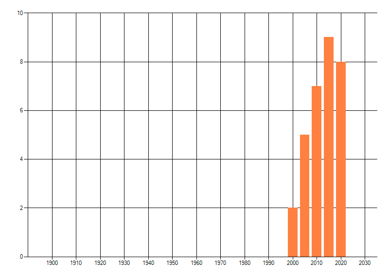 Het aantal atlasblokken (5x5 km) waarin de soort is gemeld binnen een periode van vijf jaar (vanaf 1980) of twintig jaar. Niet gecorrigeerd voor waarnemersinspanning en het aantal doorgegeven waarnemingen kan sterk variëren per periode, dus een trend in verspreiding kan hier niet direct uit worden afgelezen. Het opgegeven jaartal is het eerste jaar van de periode. Bron: gevalideerde waarnemingen uit de NDFF.