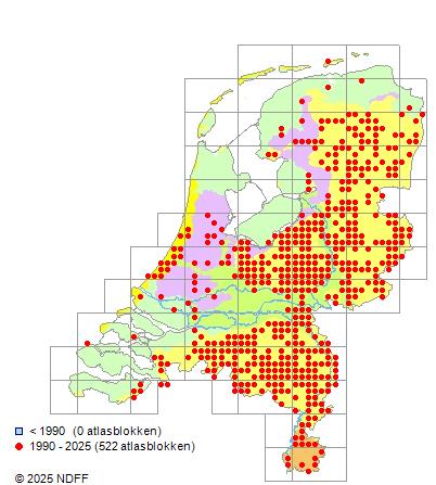 Het aantal atlasblokken (5x5 km) waarin de soort is gemeld binnen een periode van vijf jaar (vanaf 1980) of twintig jaar. Niet gecorrigeerd voor waarnemersinspanning en het aantal doorgegeven waarnemingen kan sterk variëren per periode, dus een trend in verspreiding kan hier niet direct uit worden afgelezen. Het opgegeven jaartal is het eerste jaar van de periode. Bron: gevalideerde waarnemingen uit de NDFF.