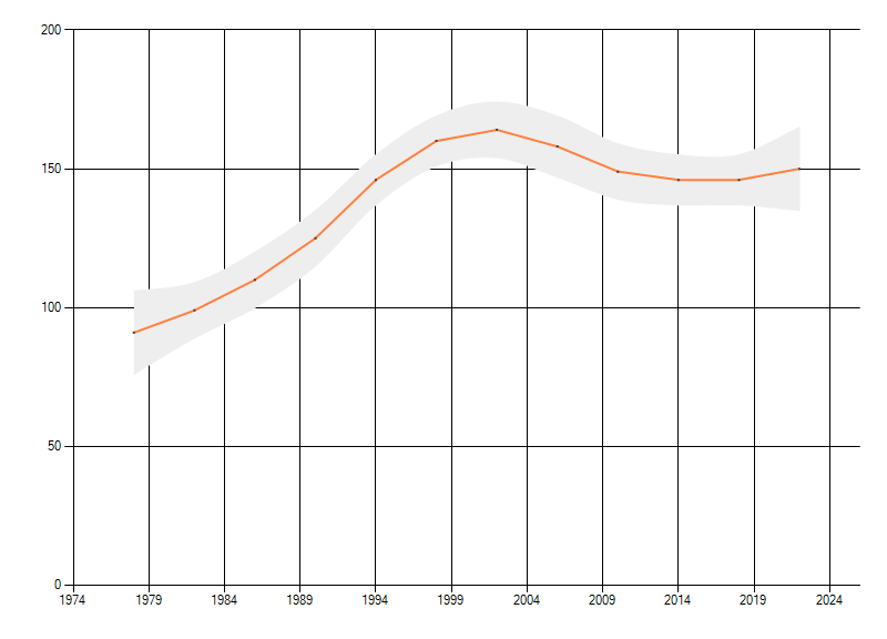Gemiddelde trend van het aantal kilometerhokken waarin de soort voorkomt, weergegeven als indexcijfer (1975-1978 = 100).