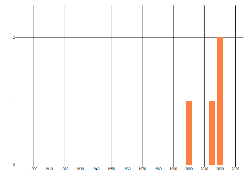 Het aantal atlasblokken (5x5 km) waarin de soort is gemeld binnen een periode van vijf jaar (vanaf 1980) of twintig jaar. Niet gecorrigeerd voor waarnemersinspanning en het aantal doorgegeven waarnemingen kan sterk variëren per periode, dus een trend in verspreiding kan hier niet direct uit worden afgelezen. Het opgegeven jaartal is het eerste jaar van de periode. Bron: gevalideerde waarnemingen uit de NDFF.