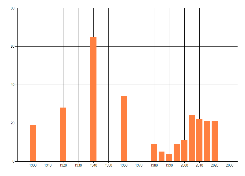 Het aantal atlasblokken (5x5 km) waarin de soort is gemeld binnen een periode van vijf jaar (vanaf 1980) of twintig jaar. Niet gecorrigeerd voor waarnemersinspanning en het aantal doorgegeven waarnemingen kan sterk variëren per periode, dus een trend in verspreiding kan hier niet direct uit worden afgelezen. Het opgegeven jaartal is het eerste jaar van de periode. Bron: gevalideerde waarnemingen uit de NDFF.