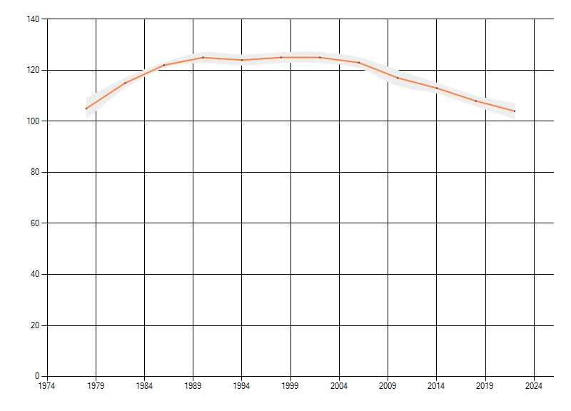 Gemiddelde trend van het aantal kilometerhokken waarin de soort voorkomt, weergegeven als indexcijfer (1975-1978 = 100).