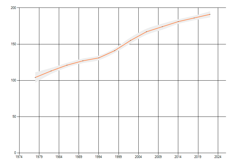 Gemiddelde trend van het aantal kilometerhokken waarin de soort voorkomt, weergegeven als indexcijfer (1975-1978 = 100).