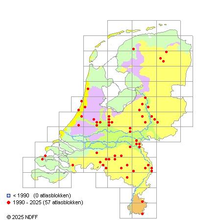 Het aantal atlasblokken (5x5 km) waarin de soort is gemeld binnen een periode van vijf jaar (vanaf 1980) of twintig jaar. Niet gecorrigeerd voor waarnemersinspanning en het aantal doorgegeven waarnemingen kan sterk variëren per periode, dus een trend in verspreiding kan hier niet direct uit worden afgelezen. Het opgegeven jaartal is het eerste jaar van de periode. Bron: gevalideerde waarnemingen uit de NDFF.