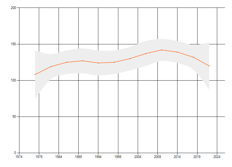 Gemiddelde trend van het aantal kilometerhokken waarin de soort voorkomt, weergegeven als indexcijfer (1975-1978 = 100).