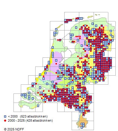 Het aantal atlasblokken (5x5 km) waarin de soort is gemeld binnen een periode van vijf jaar (vanaf 1980) of twintig jaar. Niet gecorrigeerd voor waarnemersinspanning en het aantal doorgegeven waarnemingen kan sterk variëren per periode, dus een trend in verspreiding kan hier niet direct uit worden afgelezen. Het opgegeven jaartal is het eerste jaar van de periode. Bron: gevalideerde waarnemingen uit de NDFF.