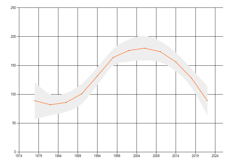 Gemiddelde trend van het aantal kilometerhokken waarin de soort voorkomt, weergegeven als indexcijfer (1975-1978 = 100).