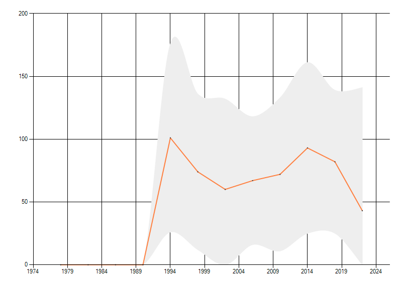 Gemiddelde trend van het aantal kilometerhokken waarin de soort voorkomt, weergegeven als indexcijfer (1975-1978 = 100). De trend is gecorrigeerd voor waarnemersinspanning en geeft de relatieve verandering in het aantal bezette kilometerhokken weer. Voor de berekening worden de data per periode van vier jaar samengenomen. In de grafiek correspondeert ieder punt met het laatste jaar van zo'n periode.