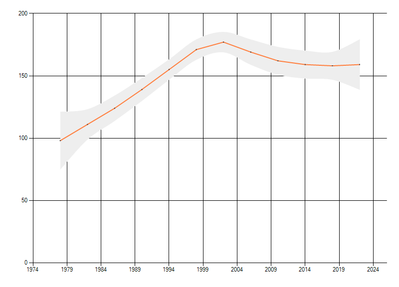 Gemiddelde trend van het aantal kilometerhokken waarin de soort voorkomt, weergegeven als indexcijfer (1975-1978 = 100).