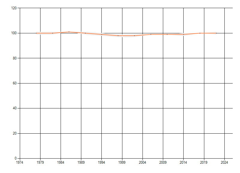 Gemiddelde trend van het aantal kilometerhokken waarin de soort voorkomt, weergegeven als indexcijfer (1975-1978 = 100). De trend is gecorrigeerd voor waarnemersinspanning en geeft de relatieve verandering in het aantal bezette kilometerhokken weer. Voor de berekening worden de data per periode van vier jaar samengenomen. In de grafiek correspondeert ieder punt met het laatste jaar van zo'n periode.