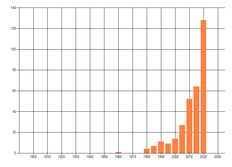 Het aantal atlasblokken (5x5 km) waarin de soort is gemeld binnen een periode van vijf jaar (vanaf 1980) of twintig jaar. Niet gecorrigeerd voor waarnemersinspanning en het aantal doorgegeven waarnemingen kan sterk variëren per periode, dus een trend in verspreiding kan hier niet direct uit worden afgelezen. Het opgegeven jaartal is het eerste jaar van de periode. Bron: gevalideerde waarnemingen uit de NDFF.