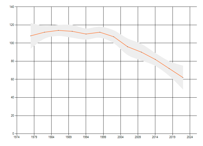 Gemiddelde trend van het aantal kilometerhokken waarin de soort voorkomt, weergegeven als indexcijfer (1975-1978 = 100).