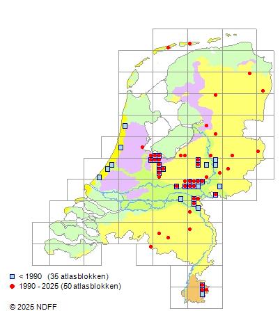 Het aantal atlasblokken (5x5 km) waarin de soort is gemeld binnen een periode van vijf jaar (vanaf 1980) of twintig jaar. Niet gecorrigeerd voor waarnemersinspanning en het aantal doorgegeven waarnemingen kan sterk variëren per periode, dus een trend in verspreiding kan hier niet direct uit worden afgelezen. Het opgegeven jaartal is het eerste jaar van de periode. Bron: gevalideerde waarnemingen uit de NDFF.