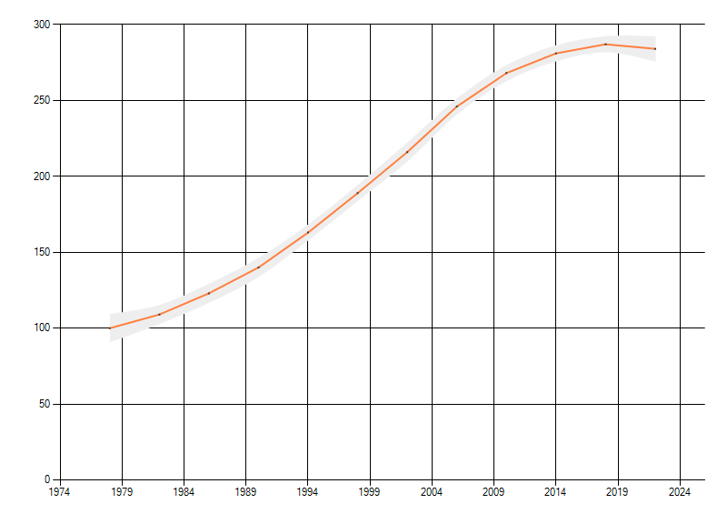 Gemiddelde trend van het aantal kilometerhokken waarin de soort voorkomt, weergegeven als indexcijfer (1975-1978 = 100).
