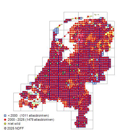 CC BY-NC-SA 3.0 NLVerspreidingNederlandPlaatselijk vrij algemeen. Zeldzaam of ontbrekend op de hooggelegen, voedselarmere zandgronden en in de zeekleigebieden.