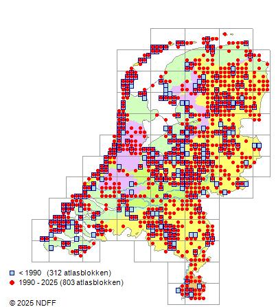 Het aantal atlasblokken (5x5 km) waarin de soort is gemeld binnen een periode van vijf jaar (vanaf 1980) of twintig jaar. Niet gecorrigeerd voor waarnemersinspanning en het aantal doorgegeven waarnemingen kan sterk variëren per periode, dus een trend in verspreiding kan hier niet direct uit worden afgelezen. Het opgegeven jaartal is het eerste jaar van de periode. Bron: gevalideerde waarnemingen uit de NDFF.