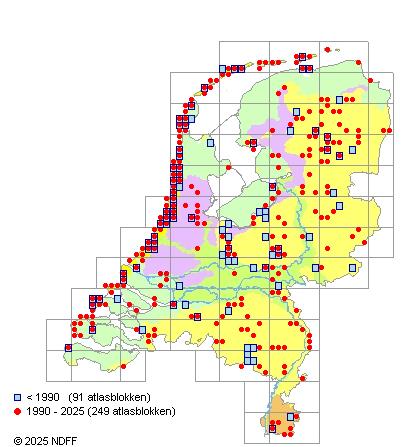 Het aantal atlasblokken (5x5 km) waarin de soort is gemeld binnen een periode van vijf jaar (vanaf 1980) of twintig jaar. Niet gecorrigeerd voor waarnemersinspanning en het aantal doorgegeven waarnemingen kan sterk variëren per periode, dus een trend in verspreiding kan hier niet direct uit worden afgelezen. Het opgegeven jaartal is het eerste jaar van de periode. Bron: gevalideerde waarnemingen uit de NDFF.