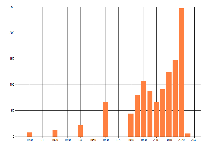 Het aantal atlasblokken (5x5 km) waarin de soort is gemeld binnen een periode van vijf jaar (vanaf 1980) of twintig jaar. Niet gecorrigeerd voor waarnemersinspanning en het aantal doorgegeven waarnemingen kan sterk variëren per periode, dus een trend in verspreiding kan hier niet direct uit worden afgelezen. Het opgegeven jaartal is het eerste jaar van de periode. Bron: gevalideerde waarnemingen uit de NDFF.