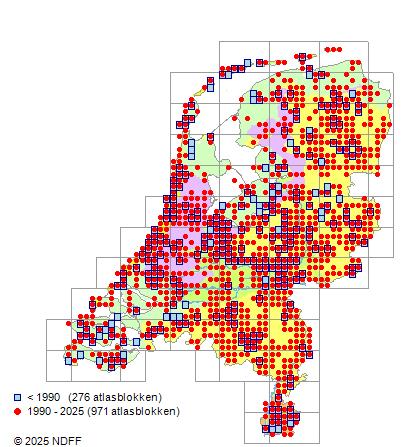 Het aantal atlasblokken (5x5 km) waarin de soort is gemeld binnen een periode van vijf jaar (vanaf 1980) of twintig jaar. Niet gecorrigeerd voor waarnemersinspanning en het aantal doorgegeven waarnemingen kan sterk variëren per periode, dus een trend in verspreiding kan hier niet direct uit worden afgelezen. Het opgegeven jaartal is het eerste jaar van de periode. Bron: gevalideerde waarnemingen uit de NDFF.