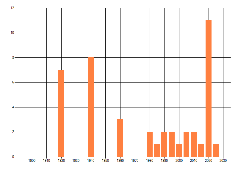 Het aantal atlasblokken (5x5 km) waarin de soort is gemeld binnen een periode van vijf jaar (vanaf 1980) of twintig jaar. Niet gecorrigeerd voor waarnemersinspanning en het aantal doorgegeven waarnemingen kan sterk variƫren per periode, dus een trend in verspreiding kan hier niet direct uit worden afgelezen. Het opgegeven jaartal is het eerste jaar van de periode. Bron: gevalideerde waarnemingen uit de NDFF.